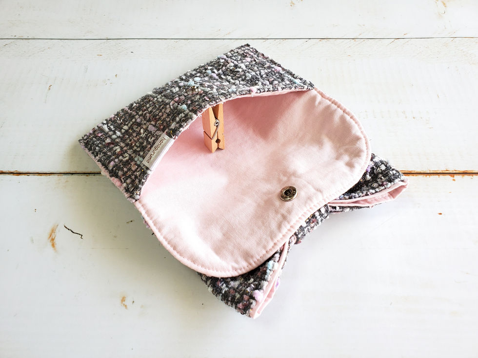 ラメ入りのツイード生地を使ったミニブックカバー、フラップポーチ、A4サイズが入るトートバッグ3点セット。